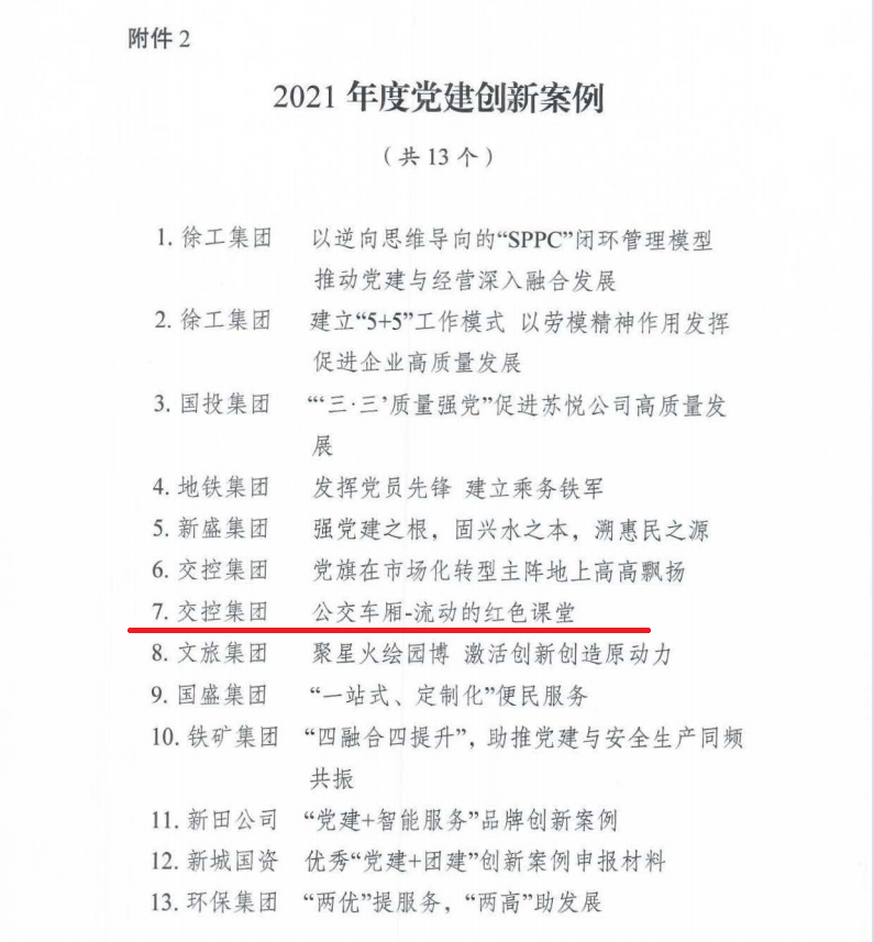 同時(shí),市國(guó)資委黨委通報(bào)了2021 年度十佳黨建品牌和優(yōu)秀"黨建+"創(chuàng)新案例評(píng)選表彰結(jié)果,徐州公交《公交車(chē)廂-流動(dòng)的紅色課堂》獲評(píng)2021年度黨建創(chuàng)新案例。