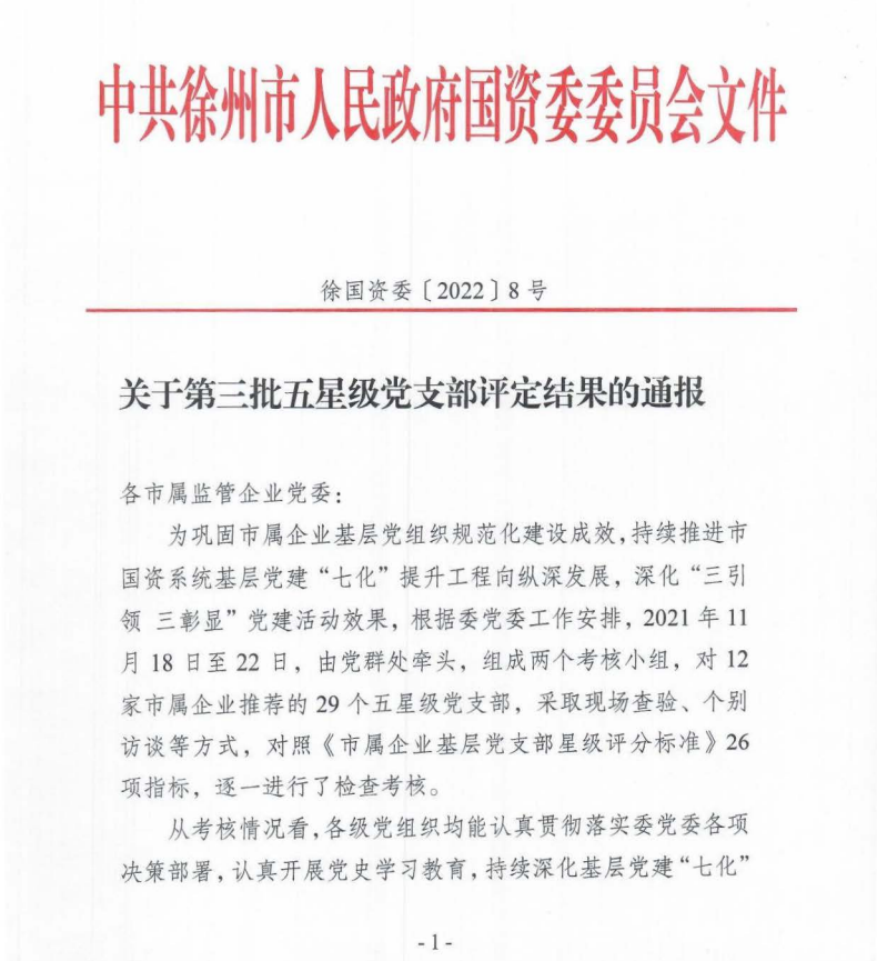 市國(guó)資委黨委還下發(fā)了《關(guān)于第三批五星級(jí)黨支部評(píng)定結(jié)果的通報(bào)》,其中徐州公交城北巴士公司黨支部、新城巴士公司黨支部被命名為“五星級(jí)黨支部”。
